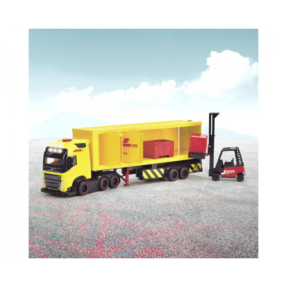 El camión Volvo DHL de Dickie Toys es un juguete detallado e interactivo que cuenta con un mecanismo de rodadura libre, permitiendo que se deslice suavemente por diversas superficies. Incluye un área de carga con apertura lateral y un camión de carretilla elevadora, lo que permite a los niños cargar y descargar paquetes sin esfuerzo. El set viene con accesorios de juego que mejoran la experiencia general, fomentando el juego de roles y la creatividad.