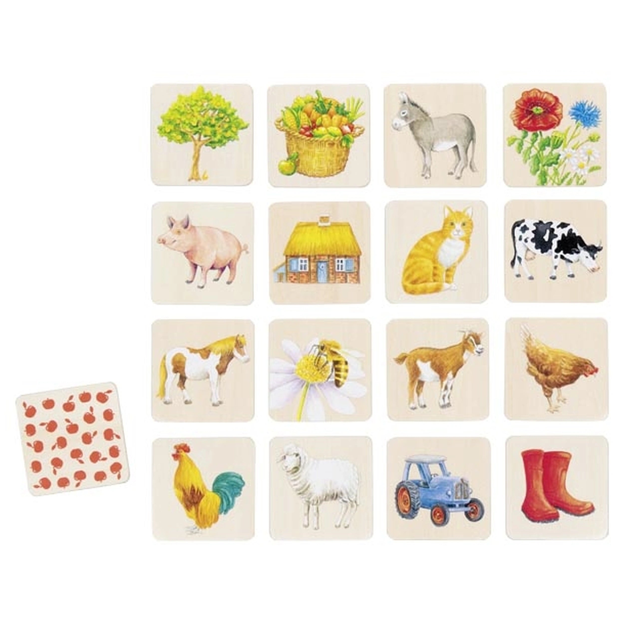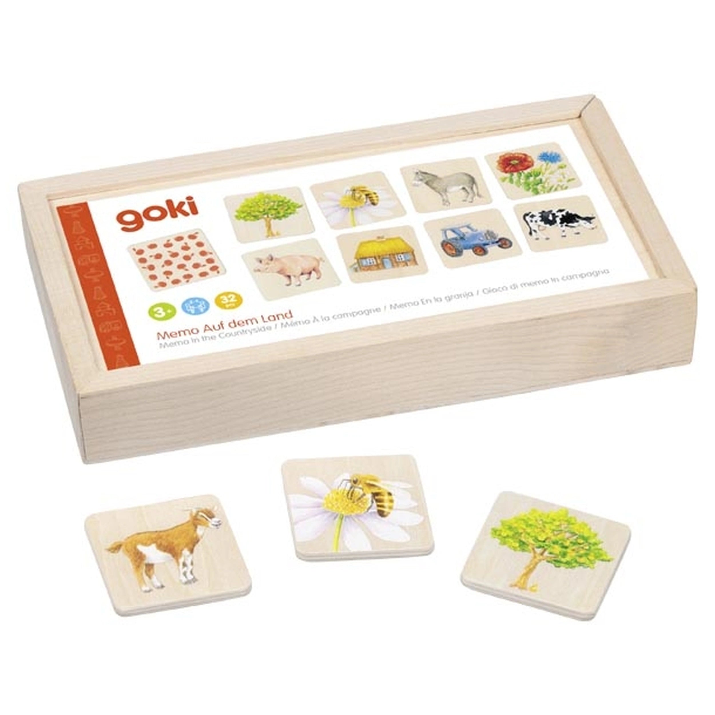 Introducing the GOLLNESS GOKI - Memo In the Countryside, a delightful 32-piece farm memory game designed to engage players of all ages. This charming game features beautifully crafted wooden tiles, each measuring 5 x 5 x 0.5 cm, making them easy to handle for both children and adults. The vibrant illustrations depict various farm animals and scenes, bringing the countryside to life and creating an immersive experience that captivates players from the very first turn.