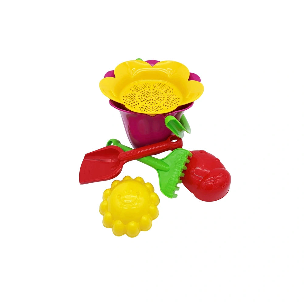 The set includes a charming flower bucket, a matching sieve, a shovel, a rake, and two adorable sand molds shaped like a sun and a beetle. Each component is thoughtfully designed to encourage children to explore their surroundings, dig, rake, and sift through sand, fostering their motor skills and hand-eye coordination. The versatility of this set allows children to build sandcastles, create intricate designs, or simply enjoy the tactile experience of playing with sand.