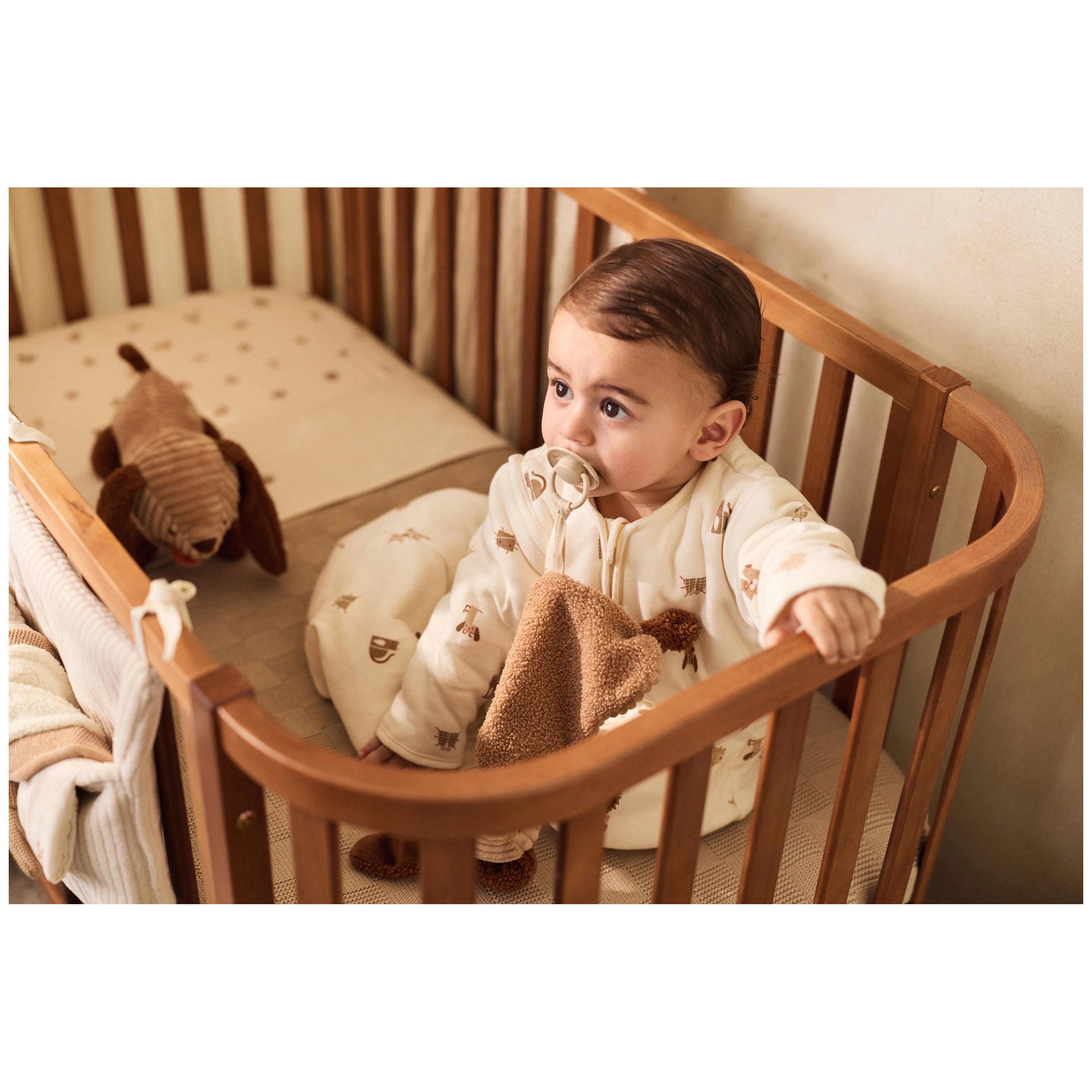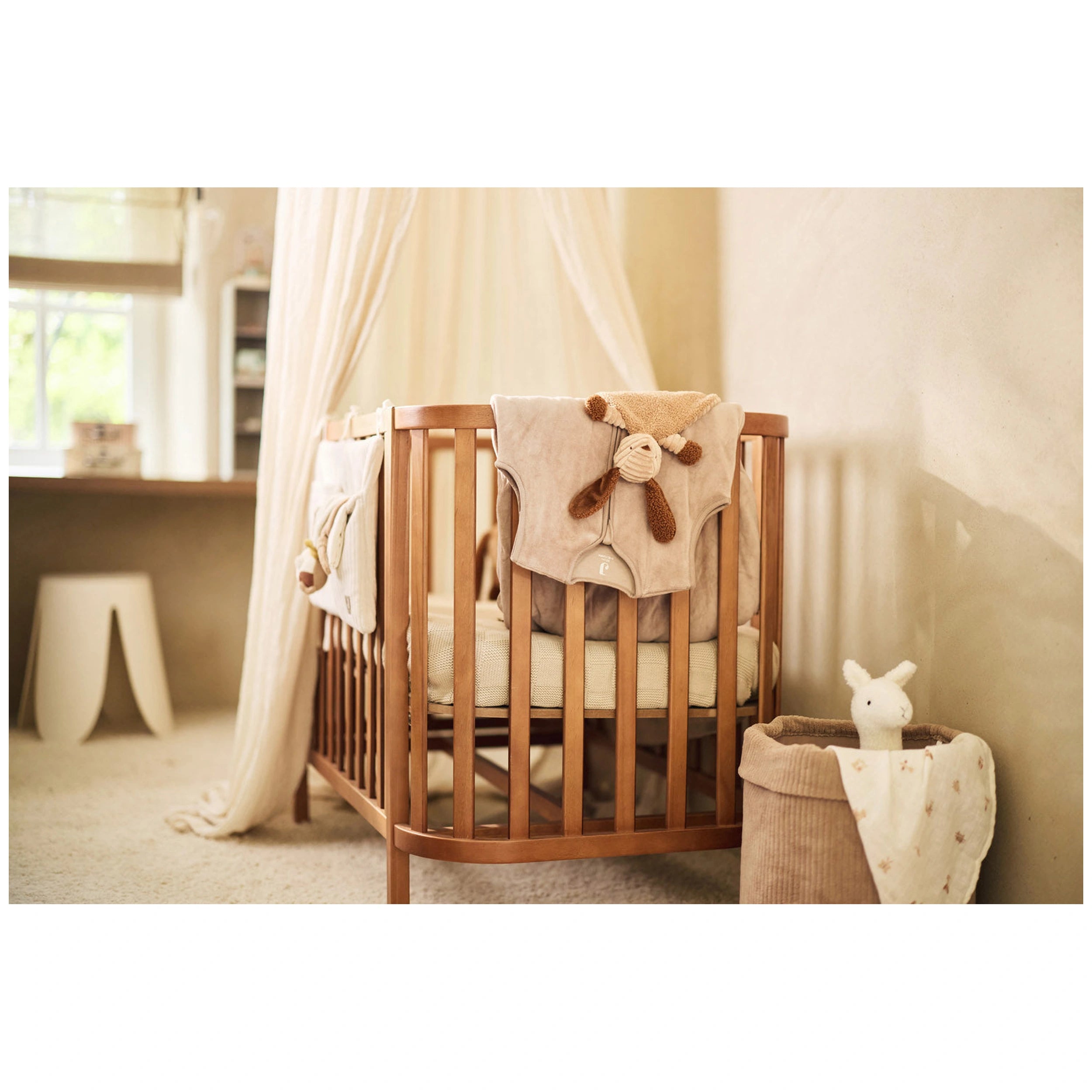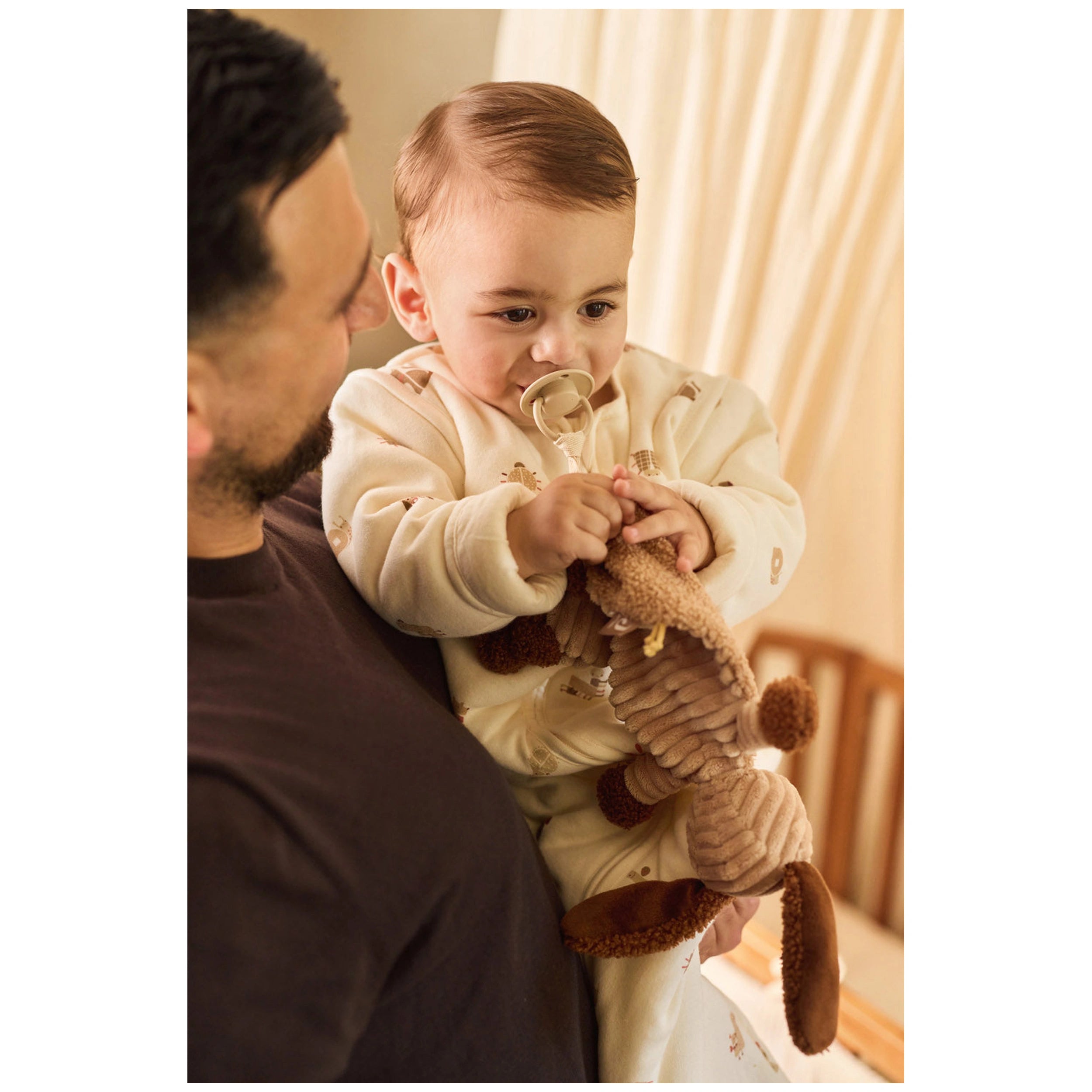 Introducing the Jollein Pacifier Cloth from the delightful Animal Friends collection, a charming accessory designed to bring comfort and joy to your little one. This unique pacifier cloth features an adorable dog named Diego, crafted from soft ribbed fabric in a warm biscuit color. The thoughtful design includes leather brown bouclé ears, paws, and feet, making it not only a practical item but also a delightful companion for your baby.