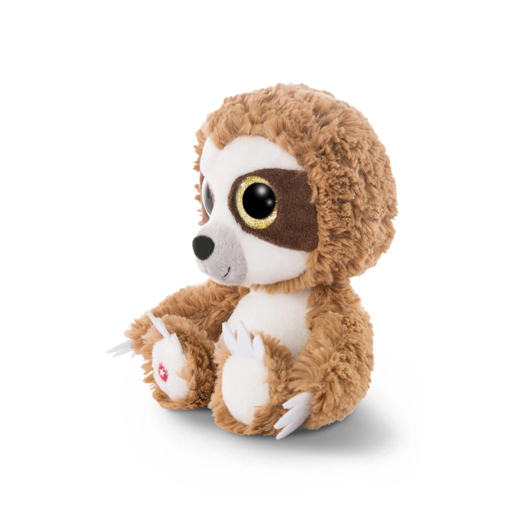 The GLUBSCHIS Sloth Heywood is characterized by its adorable sloth eye mask in a warm brown hue set against a soft white background. This eye-catching feature, combined with large glittering gold eyes, gives Heywood a playful and enchanting appearance. The plush fur is incredibly soft to the touch, making it perfect for cuddling during nap time or playtime. The attention to detail, including the white felt claws on its arms and feet, adds to the overall charm of this lovable sloth.