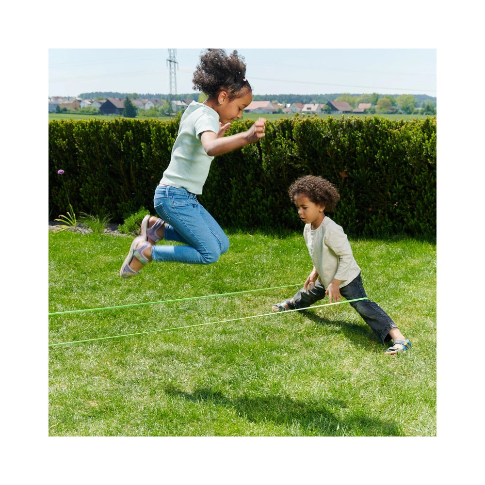 The 15 Rubber Twist Games set revitalizes a classic playground favorite with a vibrant neon elastic band that measures 3.8 meters. This high-quality rubber loop is designed for immediate play, whether in the garden, schoolyard, or park. The game involves two players stretching the band while a third jumps through various patterns, enhancing coordination and agility as they progress through different levels of difficulty.