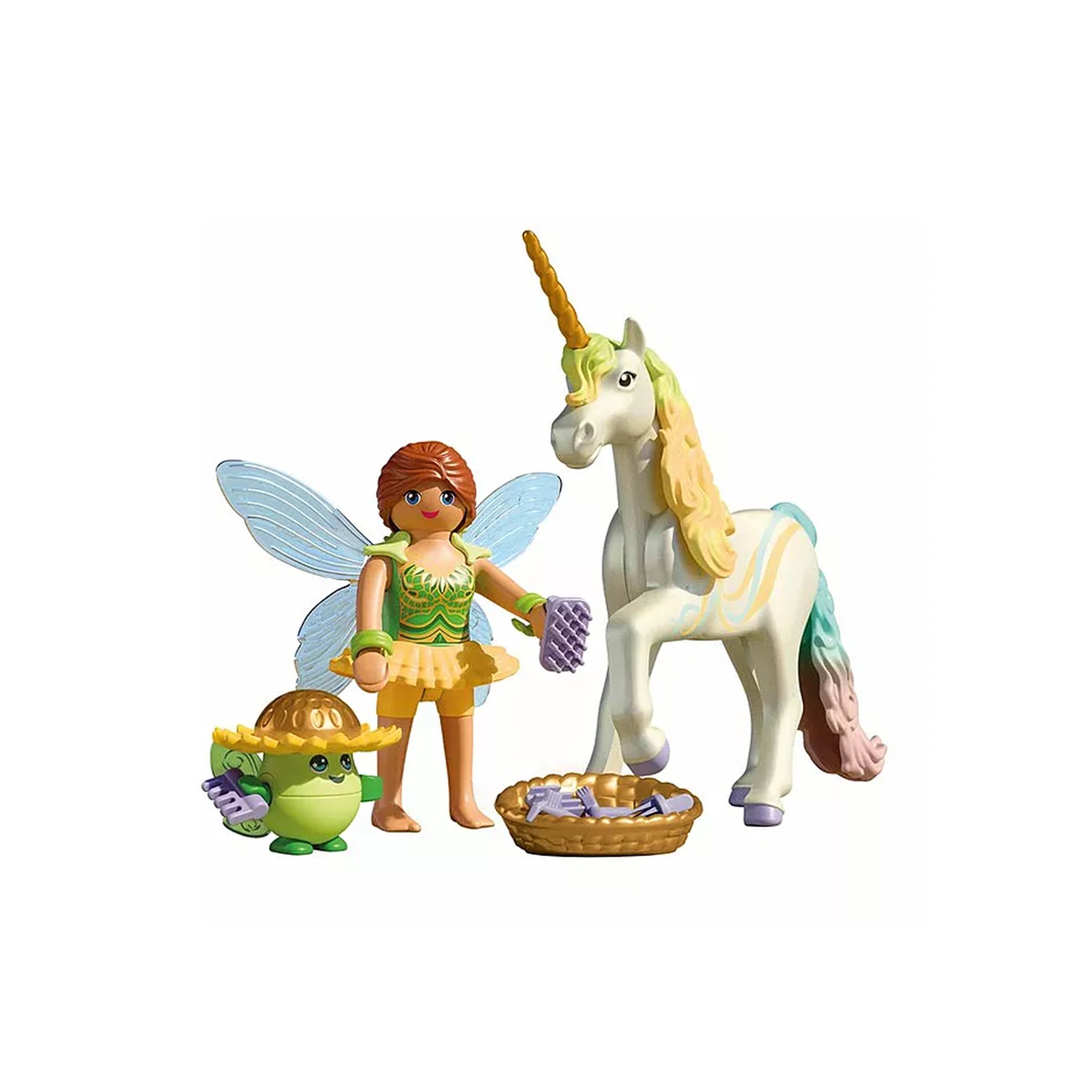 Playmobil - Unicornios Mágicos - Juegos de Juguete Presentamos el PLAYMOBIL Unicornios Mágicos - Unicornio Coleccionable: Flor Arcoíris con Hada, un cautivador juego que invita a los niños a explorar un mundo de encanto y creatividad. Este encantador set presenta a Flor Arcoíris, un impresionante unicornio conocido por su vibrante conexión con los arcoíris, junto a su encantadora compañera hada y el alegre Joyling. Juntos, emprenden aventuras mágicas que inspiran el juego imaginativo y la narración de historias. Flor Arcoíris no es un unicornio cualquiera; su radiante presencia aporta color y esperanza al Reino de los Unicornios. Con su brillante melena, cola y cuerno, los niños pueden personalizar su apariencia mezclando y combinando estas características intercambiables con otros unicornios de la serie PLAYMOBIL Unicornio. Este aspecto único del juego fomenta la creatividad y permite a los niños expresar su individualidad a través de sus diseños. La encantadora hada que acompaña a Flor Arcoíris añade una capa extra de magia al juego. Con su adorable compañero, el Joyling, ayuda a cuidar del unicornio, asegurando que cada momento en el Reino de los Unicornios esté lleno de alegría y asombro. La combinación de personajes fomenta un sentido de compañerismo y trabajo en equipo, haciendo que el tiempo de juego sea aún más atractivo. Este set de PLAYMOBIL está cuidadosamente diseñado con encantadores accesorios y detalles caprichosos que mejoran la experiencia general. Incluye una cesta, un set de cepillos, alas, un collar de alas, puños, un sombrero infantil y un pequeño par de alas. Cada accesorio añade profundidad al escenario de juego, permitiendo a los niños sumergirse completamente en sus aventuras imaginativas. Perfecto para pequeños soñadores que valoran la creatividad, el brillo y la narración de historias, el set de PLAYMOBIL Unicornios Mágicos es un regalo ideal para cumpleaños, fiestas o cualquier ocasión especial. No solo entretiene, sino que también fomenta el desarrollo cognitivo a través del juego imaginativo, convirtiéndolo en una valiosa adición a la colección de juguetes de cualquier niño. No pierdas la oportunidad de llevar a casa la magia de los PLAYMOBIL Unicornios Mágicos - Unicornio Coleccionable: Flor Arcoíris con Hada. ¡Haz tu pedido ahora y deja que la imaginación de tu hijo vuele mientras crean sus propias historias encantadoras en el vibrante Reino de los Unicornios!