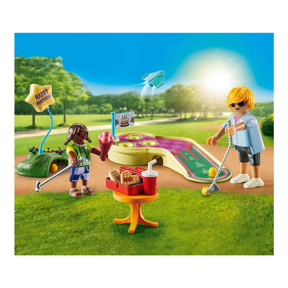 The Playmobil My Life Mini Golf set features three uniquely designed holes, each presenting its own challenges and obstacles. Players can navigate through ramps, curves, and other fun elements that make each round of golf an adventure. The set includes two golf clubs and a selection of colorful golf balls, ensuring that multiple players can join in on the fun. This encourages social interaction and teamwork, making it an ideal choice for playdates or family gatherings.