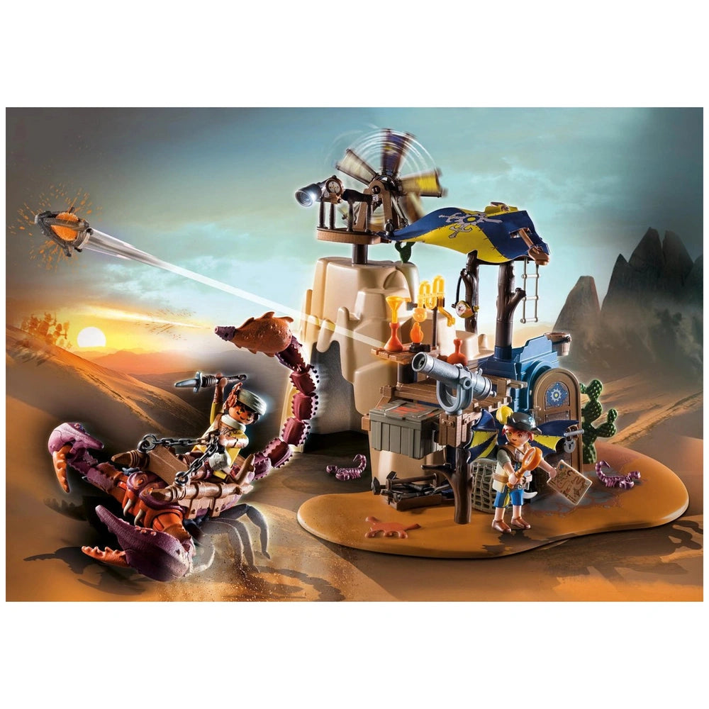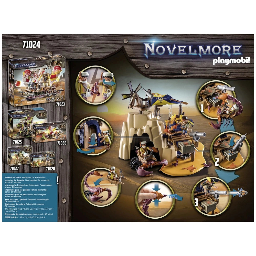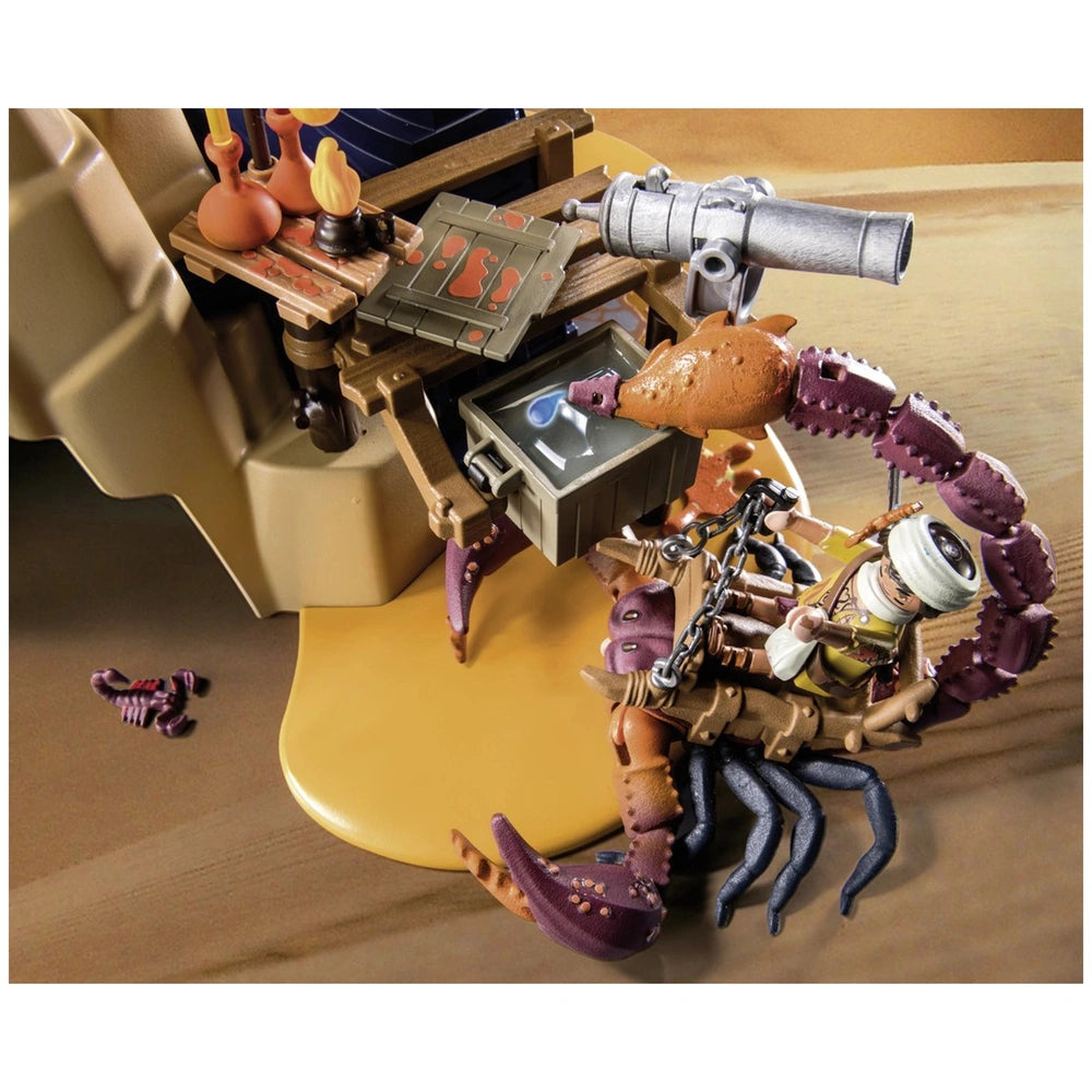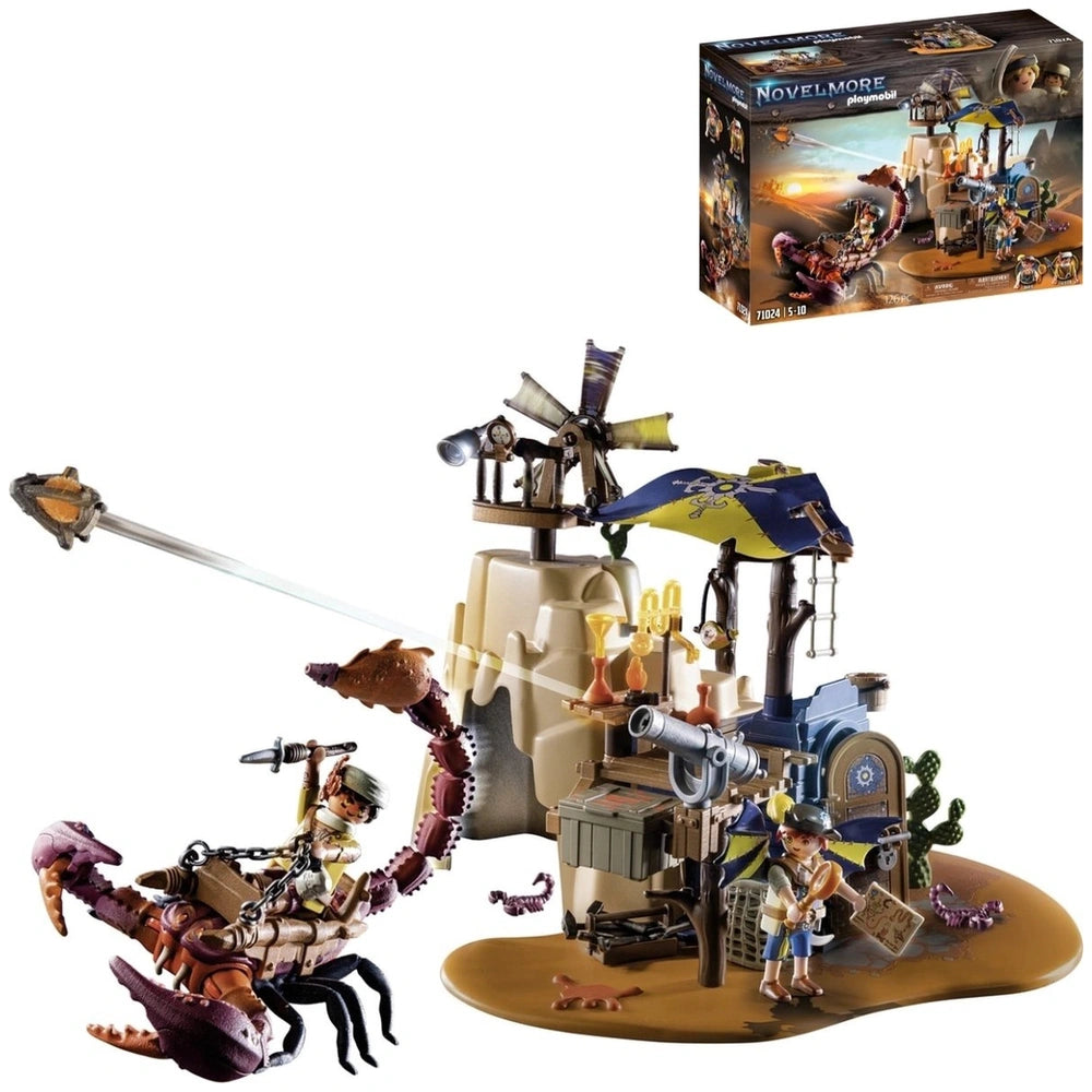 Introducing the Playmobil Novelmore Sal'Ahari Sands - Secret Base With Giant Scorpio - 71024, an exciting addition to the Playmobil collection that brings adventure and creativity to life. This imaginative playset invites children to explore the arid landscapes of Sal'Ahari Sands, where the ingenious inventor Dario and the desert-dwelling scorpion hunter have established a makeshift workshop using remnants from a shipwreck. The duo is hard at work developing poisoned arrows to combat the fearsome skeleton army, making this set not only fun but also a gateway to storytelling and role-play.