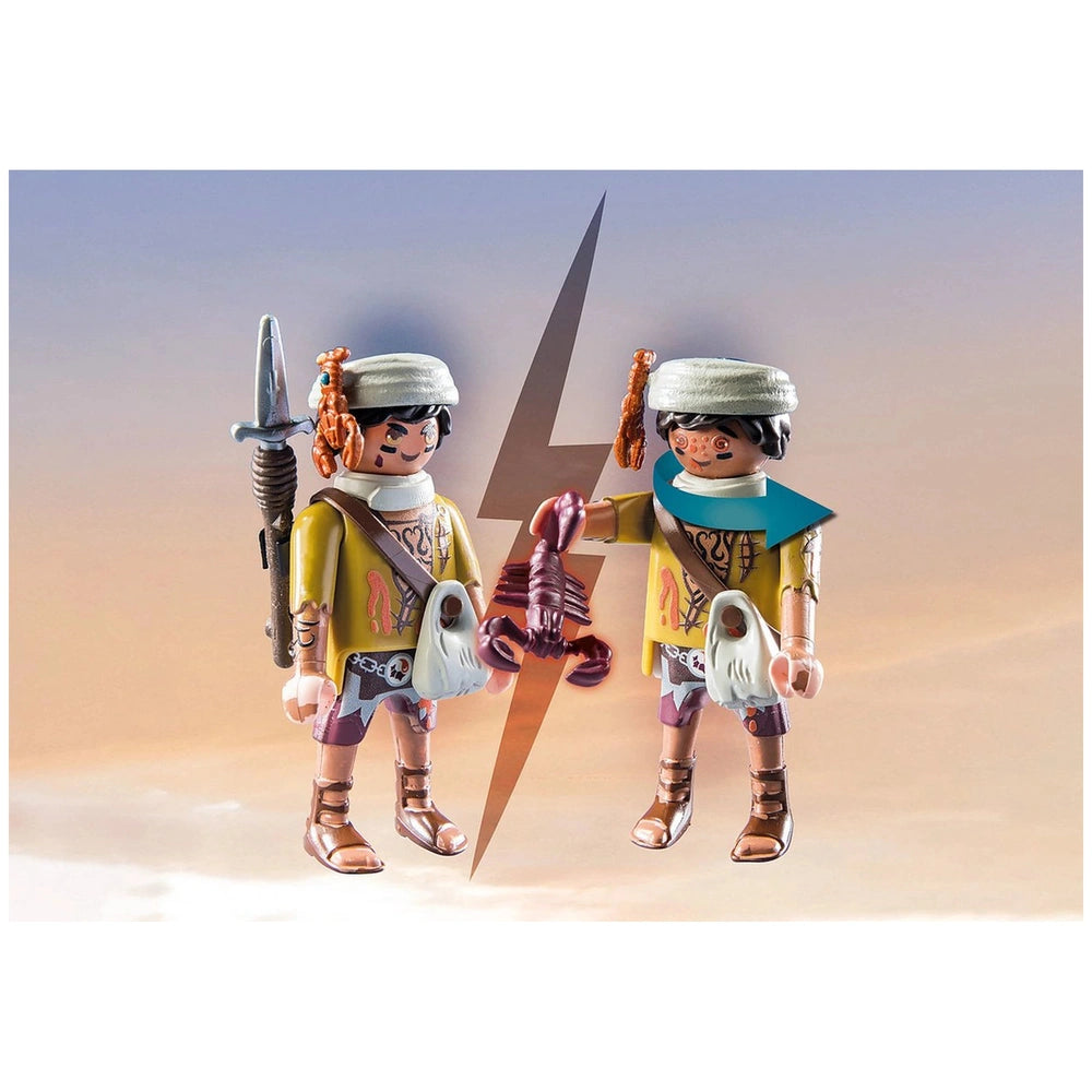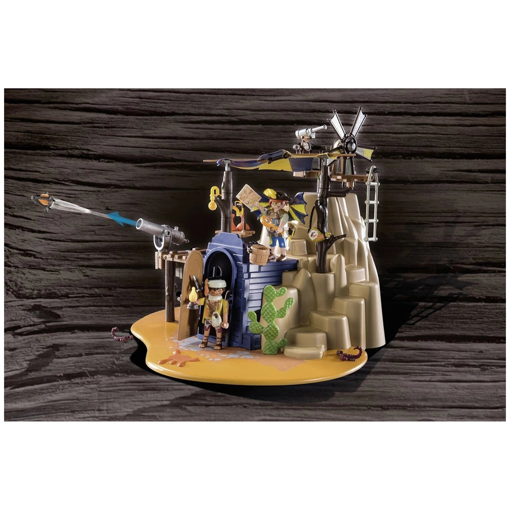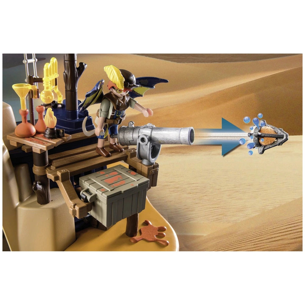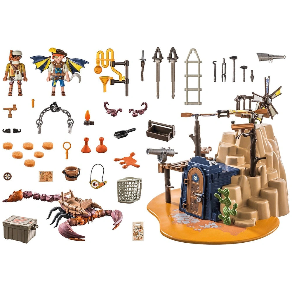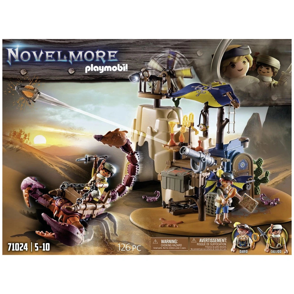 Introducing the Playmobil Novelmore Sal'Ahari Sands - Secret Base With Giant Scorpio - 71024, an exciting addition to the Playmobil collection that brings adventure and creativity to life. This imaginative playset invites children to explore the arid landscapes of Sal'Ahari Sands, where the ingenious inventor Dario and the desert-dwelling scorpion hunter have established a makeshift workshop using remnants from a shipwreck. The duo is hard at work developing poisoned arrows to combat the fearsome skeleton army, making this set not only fun but also a gateway to storytelling and role-play.