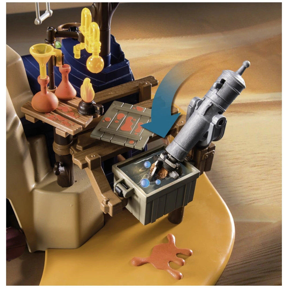 The workshop's design includes a covered upper section, accessible via a stone staircase or ladder, providing a multi-level play environment that adds depth to the storytelling. Children can easily imagine Dario and the scorpion hunter strategizing their next move from the lookout point, keeping an eye out for approaching enemies. The versatility of the playset ensures that every play session can be different, fostering creativity and problem-solving skills.