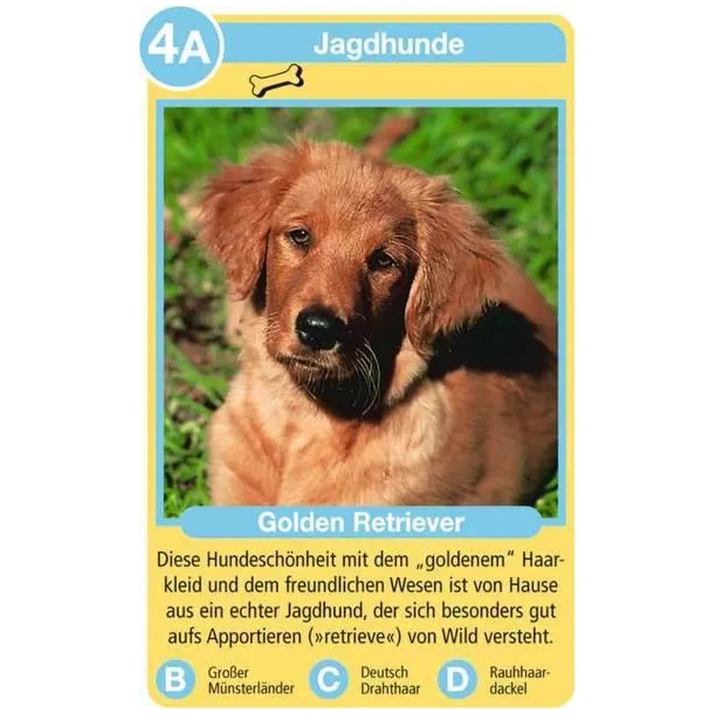 The gameplay is straightforward yet captivating. Players form quartets by collecting four cards from the same category, such as 1A, 1B, 1C, and 1D. This structure encourages strategic thinking and memory skills as players must remember which breeds are available and which questions have been answered. The cards are beautifully illustrated, showcasing the unique characteristics of each breed, making it visually appealing for players of all ages.