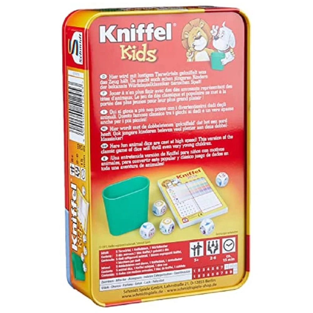 Introducing Schmidt Spiele - Kniffel Kids, an engaging children's board game that brings the excitement of classic dice rolling to young players. Designed specifically for children, this delightful game features whimsical animal dice, including a lion, duck, cat, elephant, and dog. Each roll offers the chance to create valuable animal combinations, making every turn a thrilling experience. The vibrant illustrations and playful theme ensure that kids are not only entertained but also captivated by the colorful world of Kniffel.
