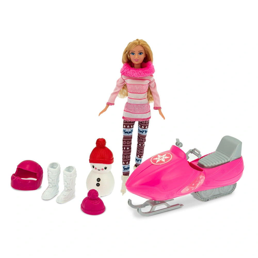 The Teorema Dea Winter Adventure Doll set invites children to embark on snowy journeys filled with creativity and excitement. Dea is dressed in a stylish winter wardrobe that combines warmth and fashion, making her the perfect companion for winter escapades. The set includes a high-speed snowmobile, allowing for realistic play as children guide Dea through imaginative snowy landscapes. With two vibrant models available, the Ice Blue Variant features a sleek silver-and-white winter coat, while the Magenta Pink Variant showcases a cozy striped pink sweater, each accompanied by uniquely designed snowmobiles.