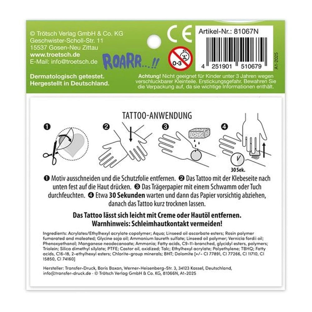 Don't miss out on the chance to add a splash of color and fun to your life with the TROETSCH VERLAG Tattoos Dinosaurier. Whether you're looking to entertain your kids, express your own creativity, or simply enjoy a bit of nostalgia, these tattoos are the perfect choice. Order your set today and let the adventure begin!