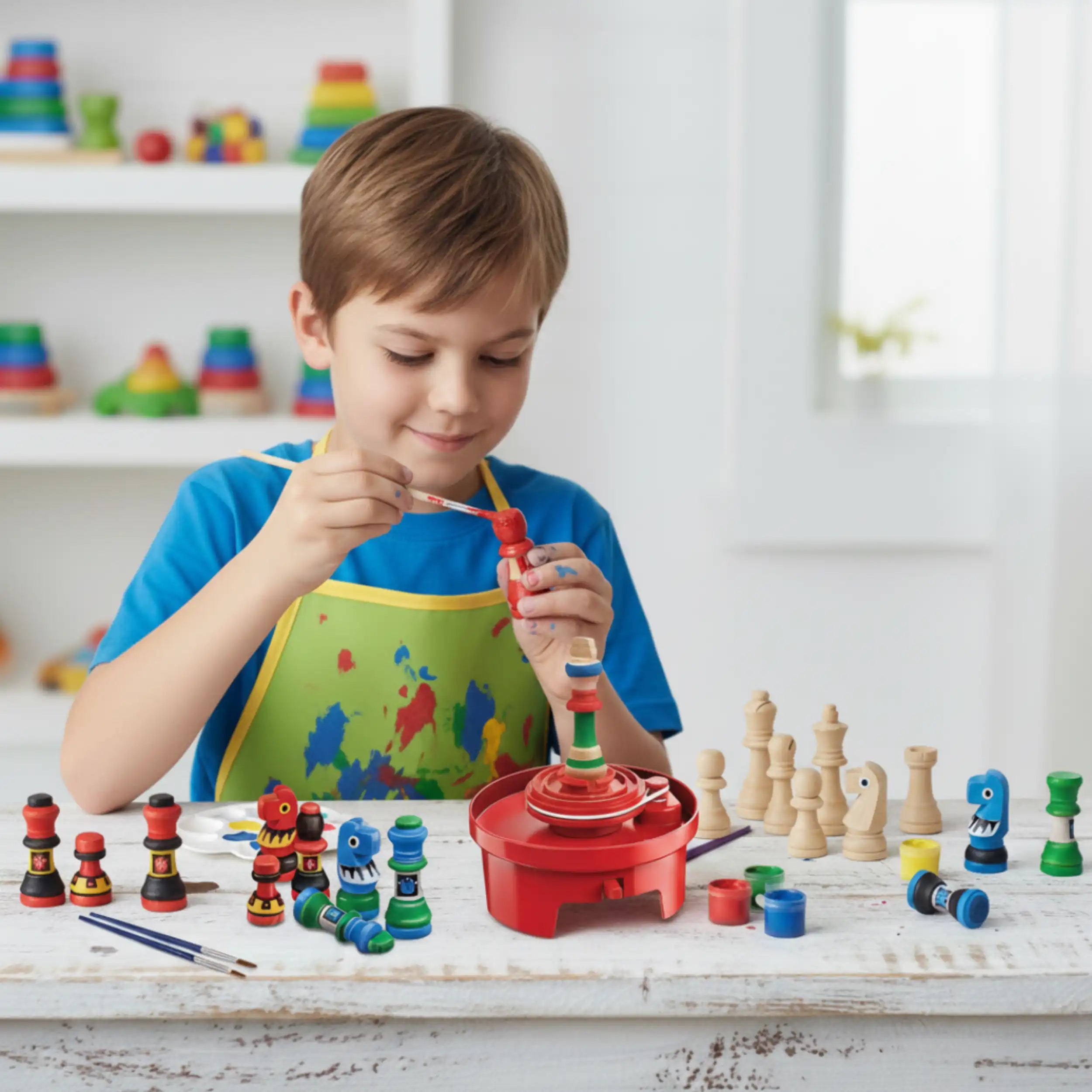 The centerpiece of this kit is the art spinner, a versatile tool that allows kids to design their very own chess set. Included are a full set of undecorated wooden chess pieces, just waiting for your child's personal touch. With the art spinner, children can easily apply colorful paint designs to each piece, enhancing their artistic skills while having fun. The spinner operates in both clockwise and anti-clockwise directions, providing a dynamic painting experience that keeps kids engaged and excited about their creations.