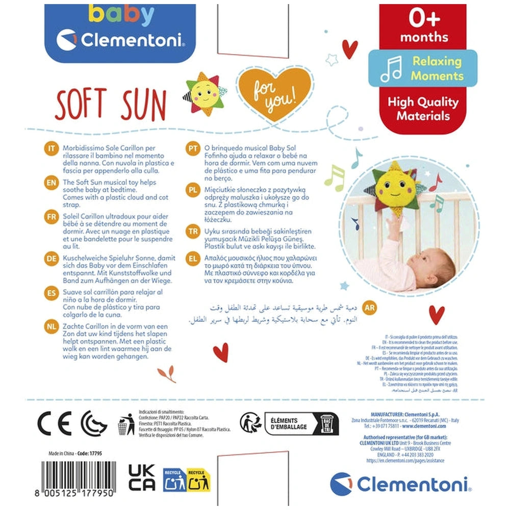Proudly designed, developed, and manufactured in Italy, the Baby Clementoni - Soft Sun Carillon embodies quality and craftsmanship. The attention to detail and commitment to safety ensure that this product meets the highest standards, providing parents with peace of mind as their children enjoy its benefits. Suitable for infants aged 0 months and older, this carillon is an ideal gift for baby showers, birthdays, or any special occasion.