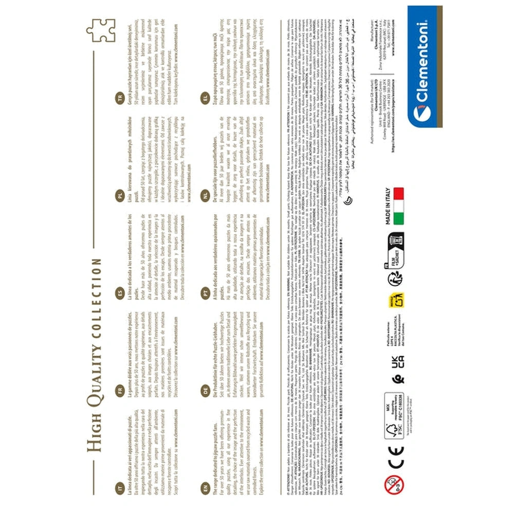 Clementoni is committed to sustainability and environmental responsibility. This puzzle is crafted using recycled materials, reflecting the company’s dedication to reducing its ecological footprint. By choosing the Lighting Venice puzzle, you are not only indulging in a delightful pastime but also supporting a brand that prioritizes the health of our planet. Made in Italy, this puzzle embodies quality craftsmanship and a passion for creating exceptional products.