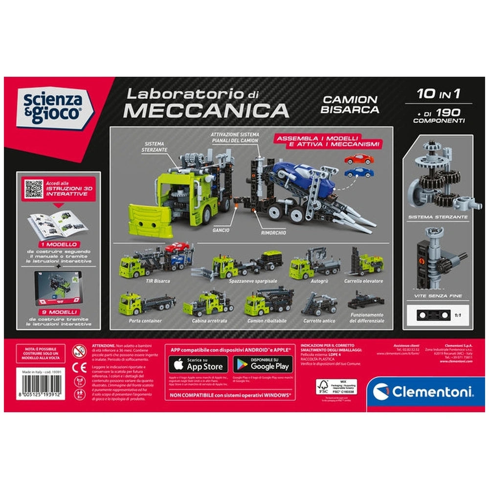 Introducing the Clementoni - Scienza & Gioco Laboratorio di Meccanica 10 in 1 Camion Bisarca STEM, an exceptional construction set designed to ignite the curiosity and creativity of young minds. This innovative multi-vehicle building kit allows children aged 8 and above to explore the fascinating world of mechanics through hands-on play. With its engaging design and educational value, this set is perfect for budding engineers and mechanics eager to learn while having fun.