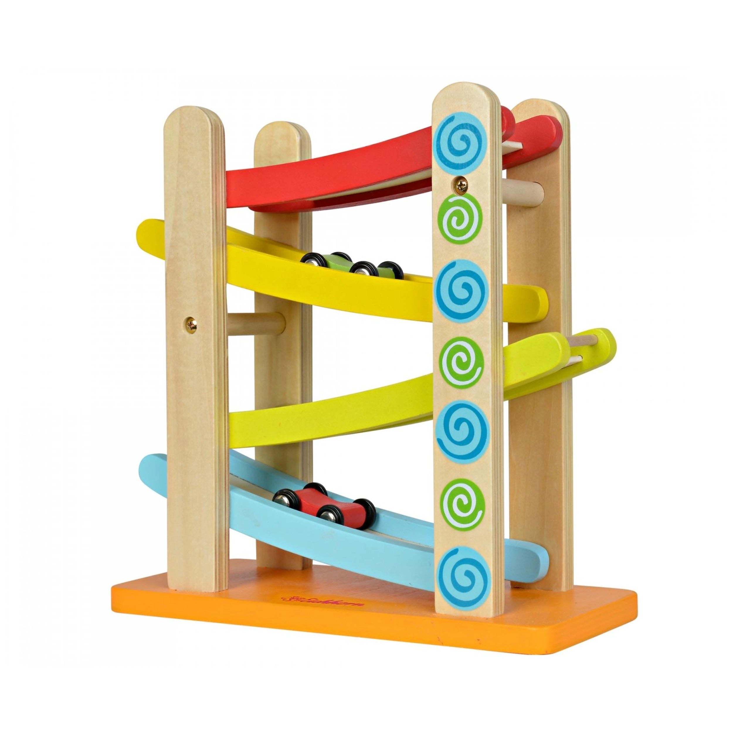 Introducing the Eichhorn Color Motor-Racing Circuit, an engaging wooden car track designed to captivate young minds while promoting essential developmental skills. This beautifully crafted activity toy invites children to embark on thrilling races with three vibrant cars, each equipped with rubber wheels for smooth gliding over the track. The design features four diagonal lanes, allowing for exciting competition and endless fun as little ones navigate their way through the twists and turns.