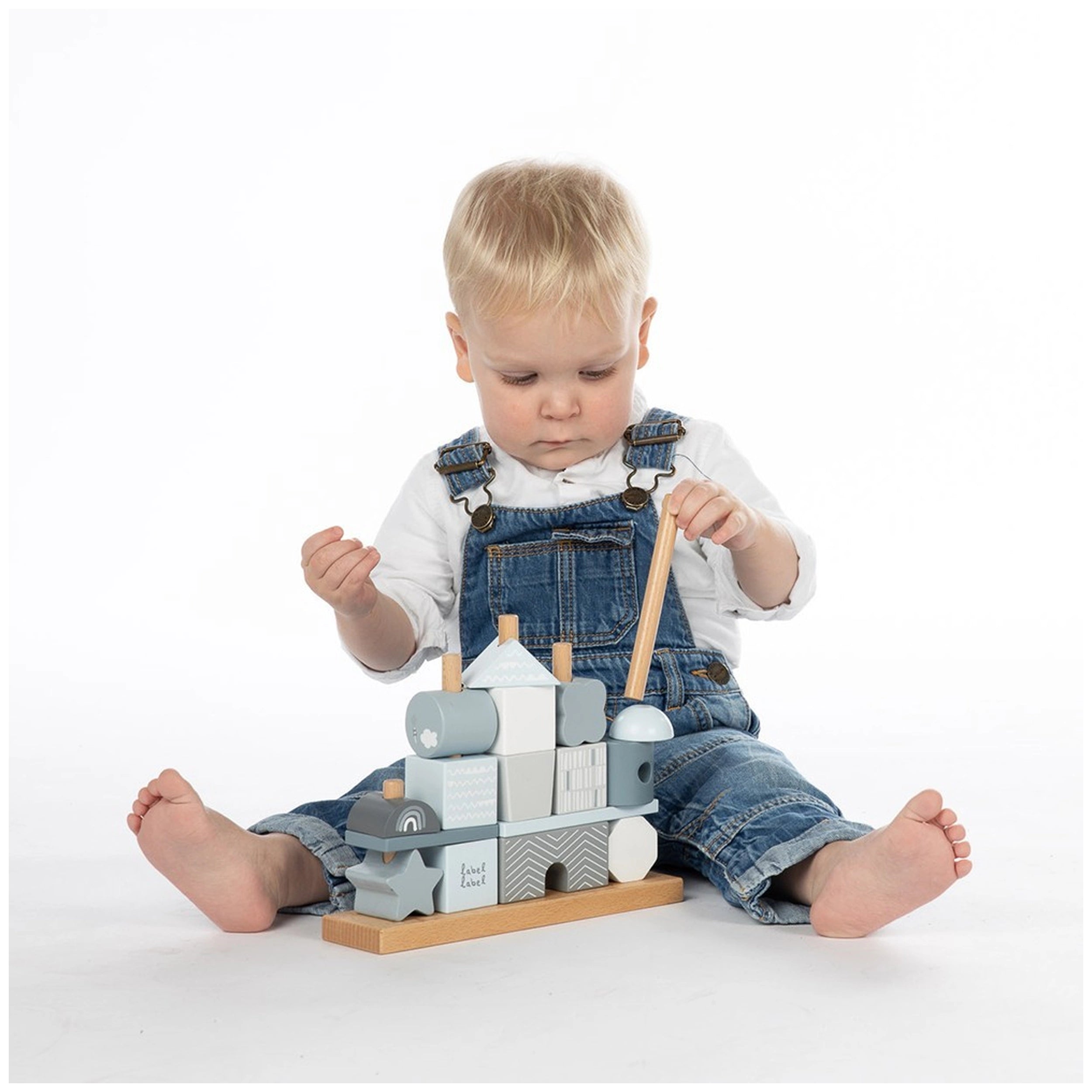 The Stacking Blocks House features a unique design that consists of four rows of wooden blocks, all presented in the iconic Label Label style. This thoughtfully designed toy includes a sturdy base, eight wooden sticks, three base plates, and a total of 14 blocks in various shapes, colors, symbols, and patterns. This variety allows your toddler to explore their creativity and imagination as they construct their very own fantasy house, making each play session a new adventure.
