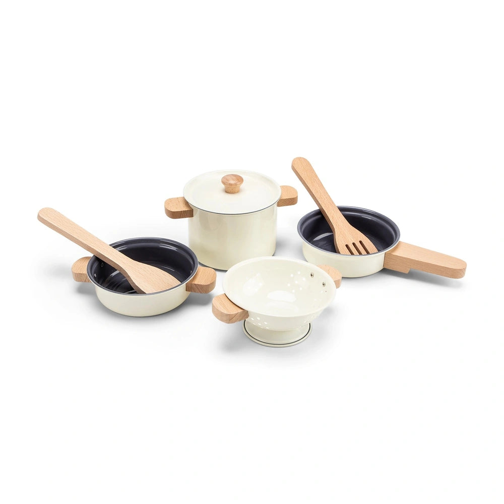 Introducing the New Classic Toys Metal Pan Set in Off White, a delightful addition to any child's play kitchen that encourages imaginative role-playing and culinary creativity. Designed for little chefs who love to mimic their parents in the kitchen, this charming cookware set is perfect for fostering a love of cooking and nurturing essential life skills. With its elegant off-white finish and wooden accents, this set not only looks great but also provides a safe and engaging way for children to explore their culinary talents.