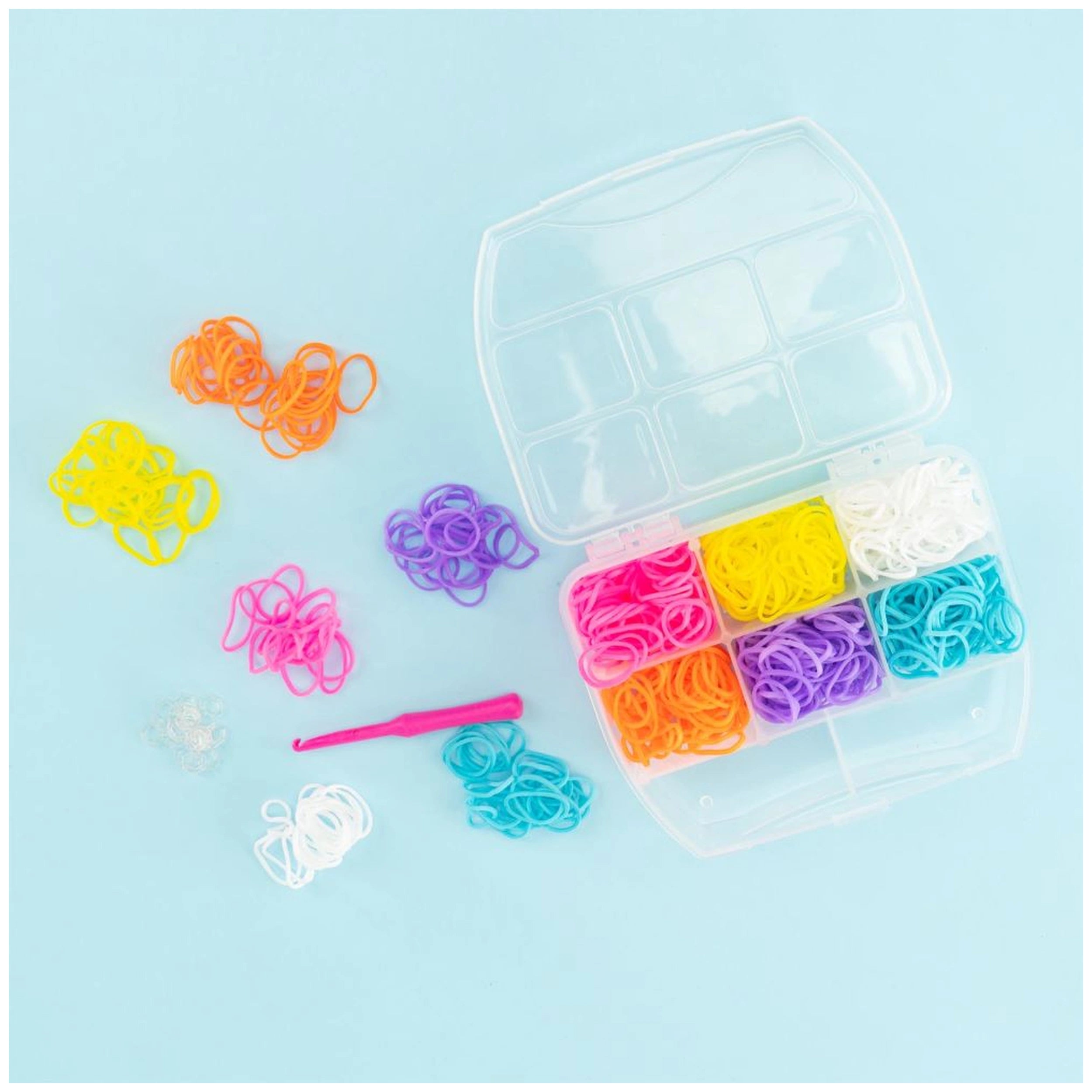 The Elasticolor Pro Refill Mini Set includes approximately 600 elastic bands in a variety of colors, ensuring that your creative projects are as colorful and diverse as your ideas. Each set comes equipped with essential tools, including a crochet hook and clips for securing your creations, making it easy to bring your designs to life. The compact mini dispenser case not only keeps your materials organized but also makes it convenient to take your crafting on the go, whether you're at home or visiting friends.