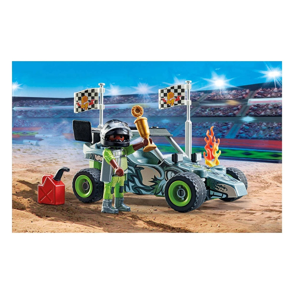 Included in the set are essential accessories that elevate the play experience. The winner's flags signal victory, while the trophy serves as a tangible reward for the young racers. The jerry can adds a realistic touch, allowing children to refuel their buggy and keep the action going. These elements encourage imaginative role-playing, as kids can create their own stunt shows and competitions, fostering social skills and teamwork.