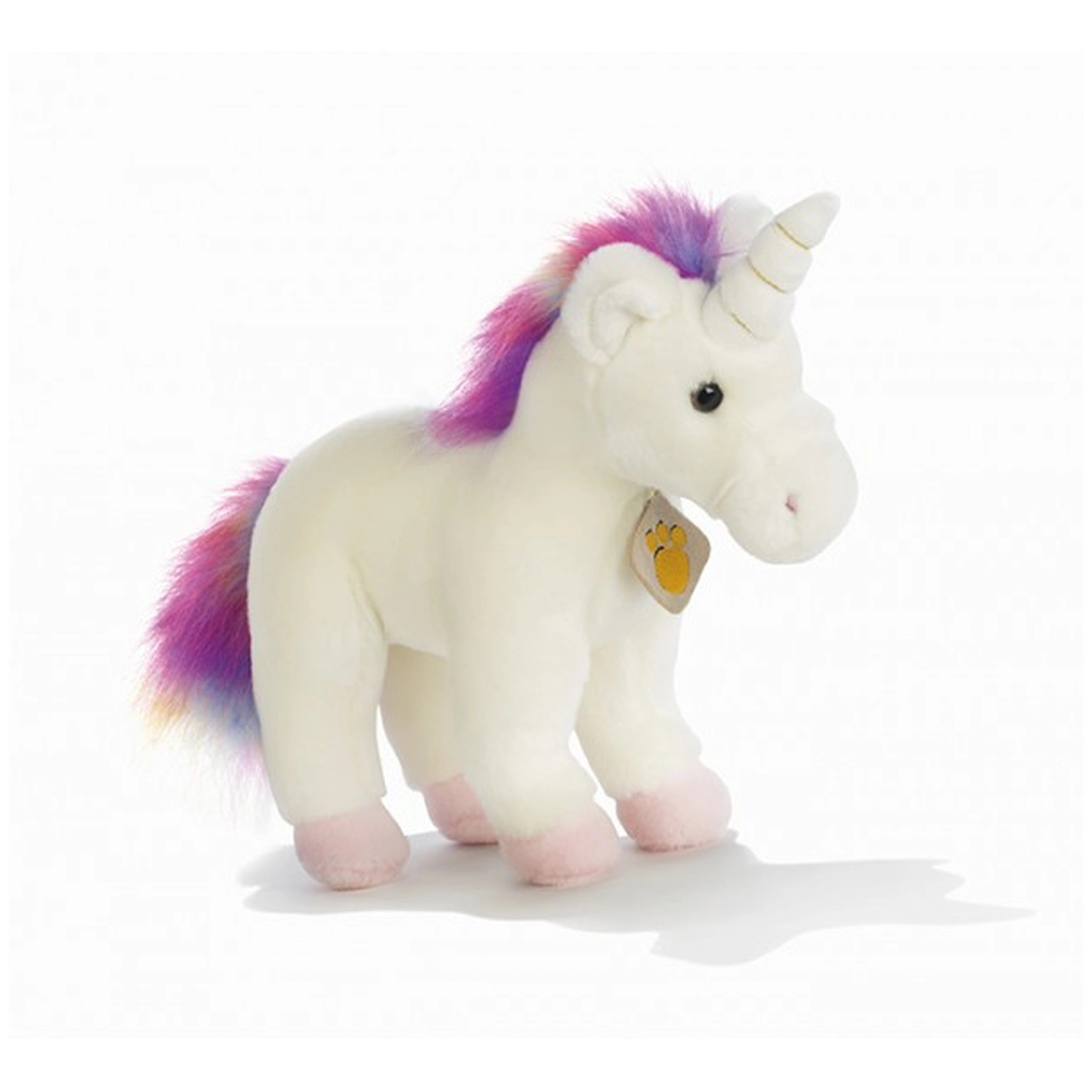 The Kerios Unicorn stands at a perfect 25 cm, making it an ideal size for little hands to hold and cuddle. Crafted with the utmost attention to detail, this plush unicorn boasts a luxuriously soft white exterior that is gentle against the skin. Its vibrant mane and tail showcase a stunning gradient of pink, purple, and blue, adding a splash of color that captures the essence of fantasy. The shiny golden spiral horn and delicate pink accents on its hooves and inner ears further enhance its magical appeal, making it a standout piece in any toy collection.