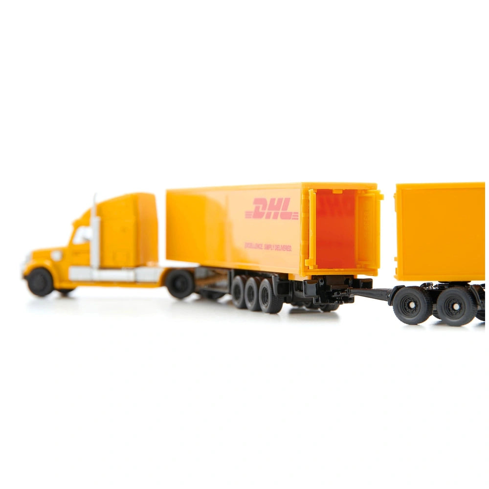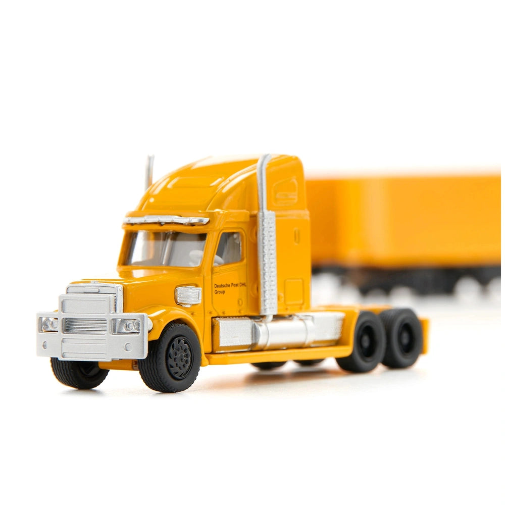 Introducing the Siku Freightliner DHL Road Train, a remarkable addition to the world of miniature play vehicles that captures the essence of American trucking culture. This meticulously crafted model is designed at a stunning 1:87 scale, making it a perfect representation of the iconic Freightliner truck. With its striking chrome details and vibrant DHL branding, this model not only serves as a toy but also as a collector's item that showcases the beauty of heavy-duty transportation.