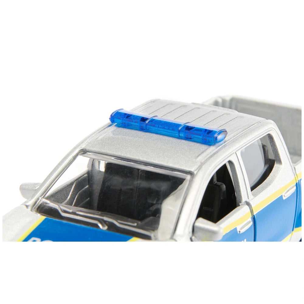 One of the standout features of this model is its rubberized tyres, which are mounted on shiny silver rims. This combination not only adds to the aesthetic appeal but also ensures excellent grip on various surfaces, making it perfect for adventurous play. Whether navigating through a carpeted landscape or racing across a smooth tabletop, the Nissan Navara Federal Police is ready to tackle any terrain, encouraging creativity and active play.