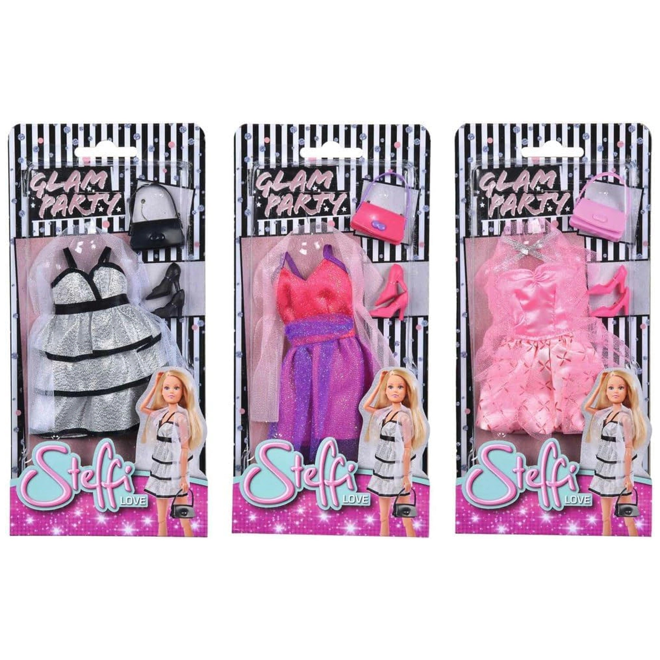 The Glamour Party Dress Set features a stunning ensemble that includes a beautifully crafted dress, complete with intricate details that reflect the latest trends in children's fashion. The dress is designed to fit snugly on Steffi Love dolls, ensuring that they look their best for any occasion. The set also includes accessories that enhance the overall look, allowing children to mix and match for a truly personalized experience. This attention to detail not only makes the dolls more appealing but also encourages imaginative storytelling and role-playing.